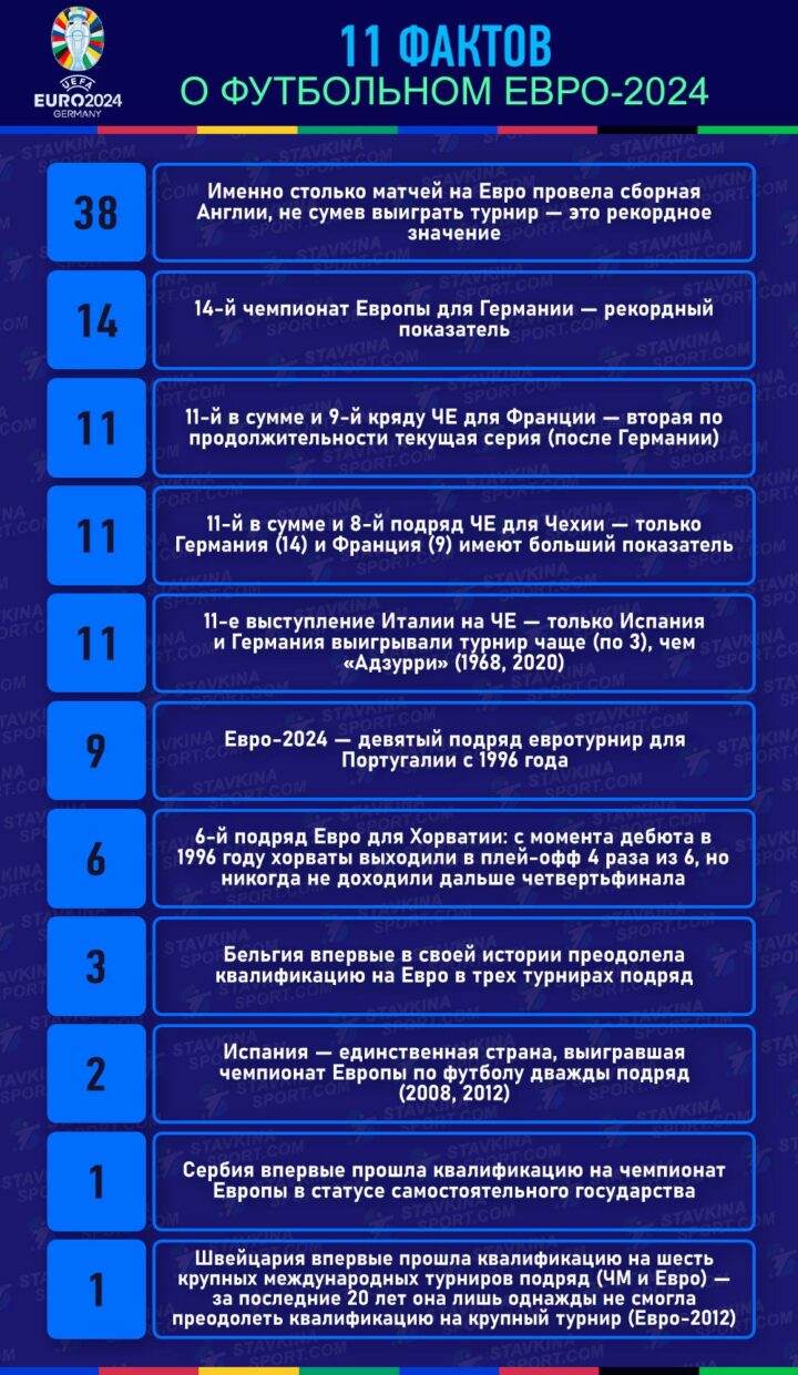 Для некоторых сборных предстоящий Евро-2024 станет дебютным, для других — рекордным. Редакция vsestavkinasport.com собрала интересные и знаковые факты о немецком чемпионате Европы текущего года. Вся информация представлена в фирменной инфографике.