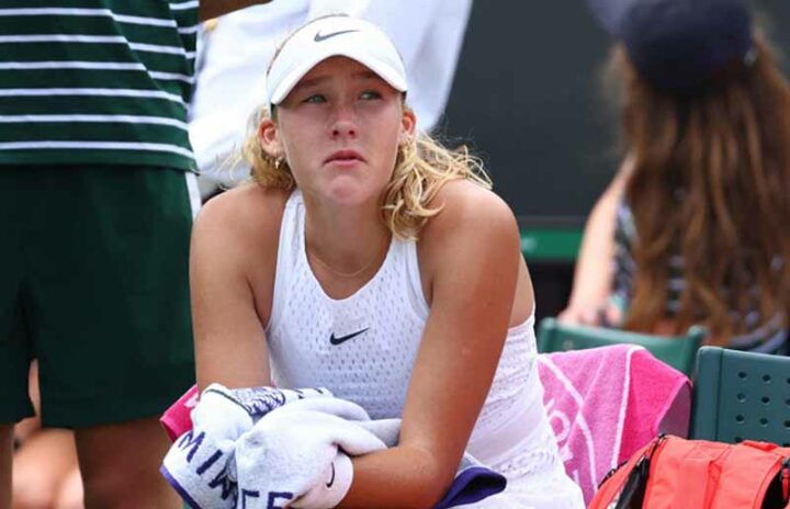 Фото: Reuters 10 июля 2023 года, Лондон. 16-летняя Мирра Андреева после поражения в 1/8 финала от Мэдисон Киз на своем дебютном Уимблдоне. С тех пор результаты россиянки на травяных кортах стали заметно хуже, а привычка плакать после неудач — осталась.