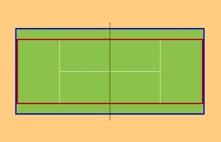 Увеличение размера площадки для командных соревнований достигается за счет добавления дополнительных боковых линий. Попадание мяча в эти зоны на одиночных турнирах рассматривается как аут.
