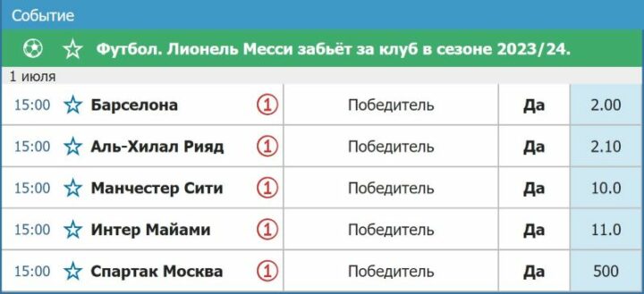 Роспись со ставкой на переход Лионеля в московский «Спартак» выставила официальная российская БК БЕТСИТИ. Этот вариант оценивается коэффициентом 500.00, который говорит о крайне невысокой вероятности сенсационного трансфера. Более возможным кажется переход Месси в «Интер» Майами из американской МЛС (11.00) и английский «Манчестер Сити» (10.00). Однако, скорее всего, Лео отправится в саудовский «Аль-Хиляль» (2.10) или каталонскую «Барселону» (2.00).