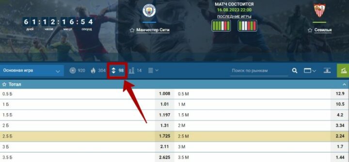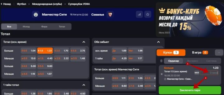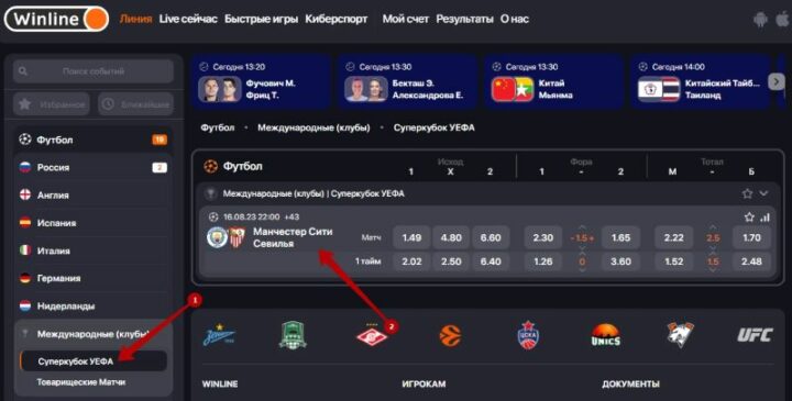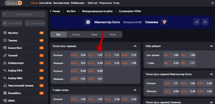 Например, беттор зарегистрировался в букмекерской конторе Винлайн, чтобы сделать ставки на тотал голов в матче Суперкубка УЕФА между «Манчестер Сити» и «Севильей». Пошаговая инструкция для заключения пари: