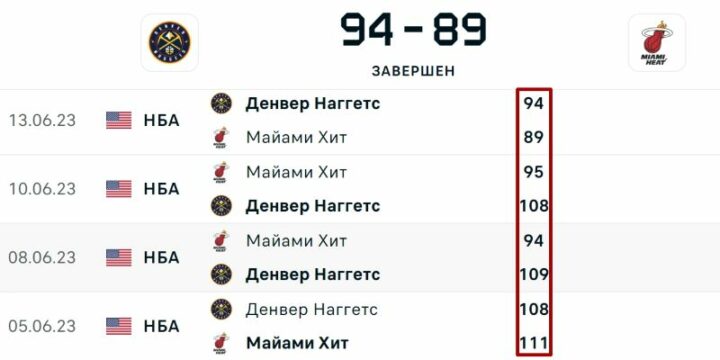 Чтобы понять, в большую или меньшую сторону ушел тотал, нужно вычесть его значение из количества совершенных в матче действий. Например, в финале НБА встречались «Денвер» и «Майами». В трех предыдущих очных противостояниях команды забрасывали на двоих больше 200 очков. Беттор ставит на то, что так произойдет и в следующей игре.