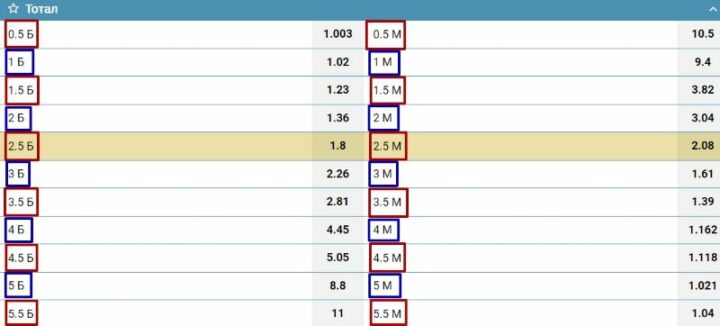 Этот рынок преимущество появляется в live, когда букмекер понимает, от какого счета ему отталкиваться при формировании линии. Например, под конец первого тайма футбольного матча на табло горит 1:1. БК выставляет два противоположных маркета — ТМ(2.5) и ТБ(2.5) в промежутке с 36 по 45 минуту.