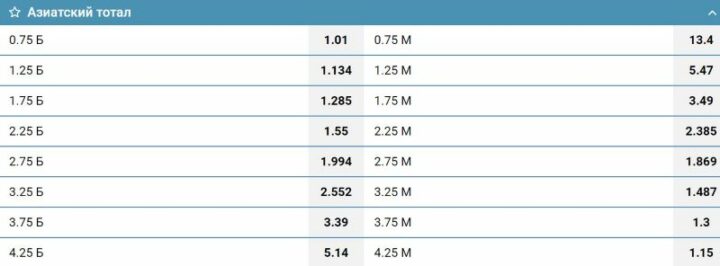 Один азиатский (четвертной) маркет состоит из двух независимых друг от друга показателей. Узнать его в линии БК можно по наличию сотых долей 0.25 или 0.75.