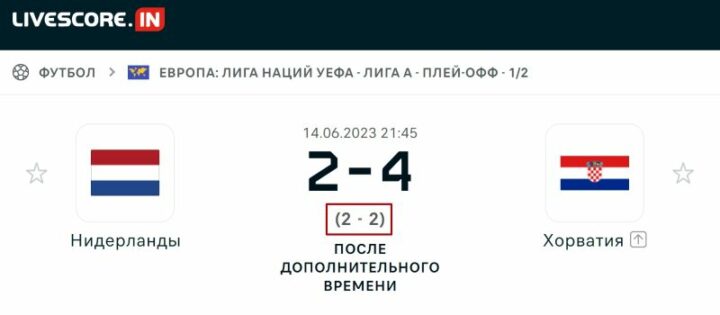 Пример: в полуфинале футбольной Лиги наций встречались сборные Нидерландов и Хорватии. Клиент БК поставил 500 рублей за коэффициент 3.14 на классический тотал в основное время матча меньше 4.25. Этот ординар делится на две части — 4 и 4.5. На проход каждой из них выделяется по 250 RUB.