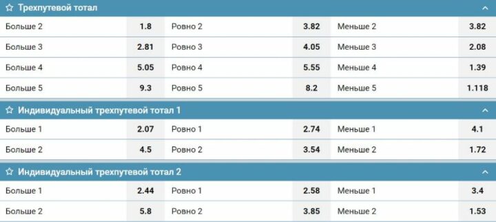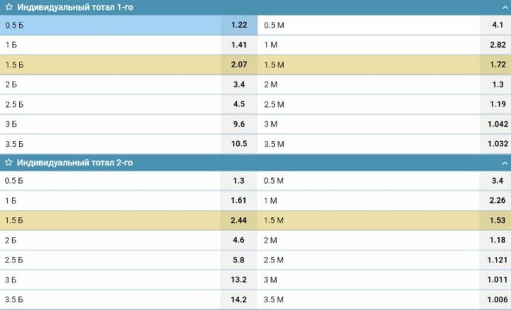 Если целые ТМ и ТБ учитывают действия обоих участников спортивного события, то индивидуальные — одного из них. ИТМ1 и ИТБ1 означают ставку на выступление первой команды — номинальных или фактических хозяев поля. Чтобы оформить пари на гостей, нужно выбрать маркет с двойкой.