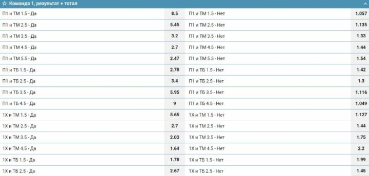 Комбинироваться могут как общий, так и индивидуальный тоталы в букмекерских конторах. Не реже результата матча к нему добавляются следующие маркеты: