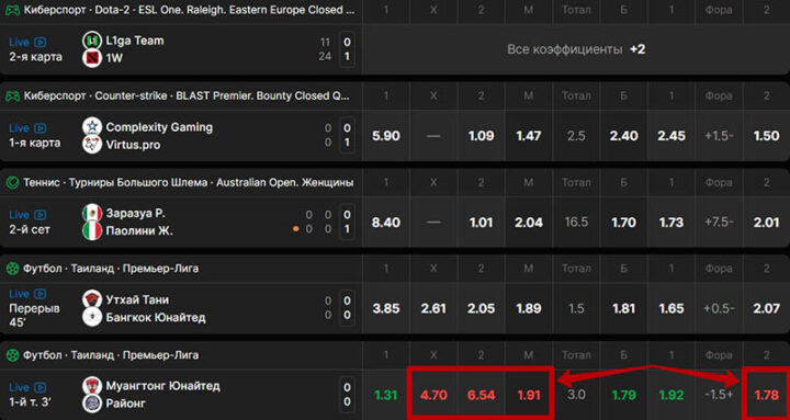 Коэффициент сильно возрастает/снижается в течение часа | С этой игрой явно что-то не то и лучше ее обойти стороной. Скорее всего, если успеть поставить на результат какого-то исхода, матч будет снят с линии, а сумма пари вернется на лицевой счет. Если волатильность котировок очень большая, то быть беде с этой игрой. |
