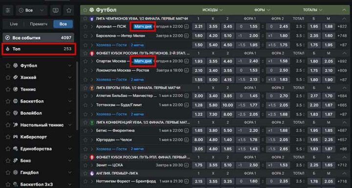 Начинающие игроки выбирают популярные дисциплины — футбол, баскетбол или хоккей. Для лайва хорошо подходят теннис, волейбол и другие виды с быстрым расчетом. Букмекер Fonbet сам указывает на события, которые привлекают большое внимание бетторов. В линии они находятся во вкладке «Топ», а также выделены как «Матч дня».