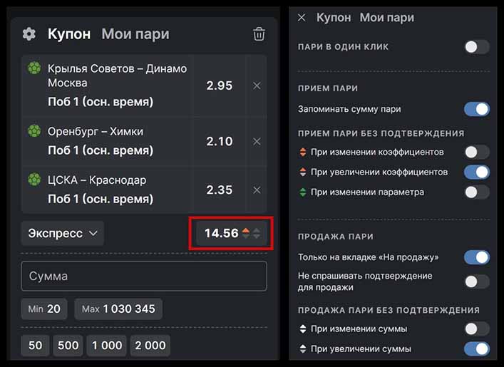 Нажав на шестеренку, можно настроить корзину сделок по предпочтениям пользователя. Бетторам разрешено указать действия конторы в случае изменения коэффициентов, установить прием пари в один клик, выбрать вид купона и воспользоваться другими полезными опциями.