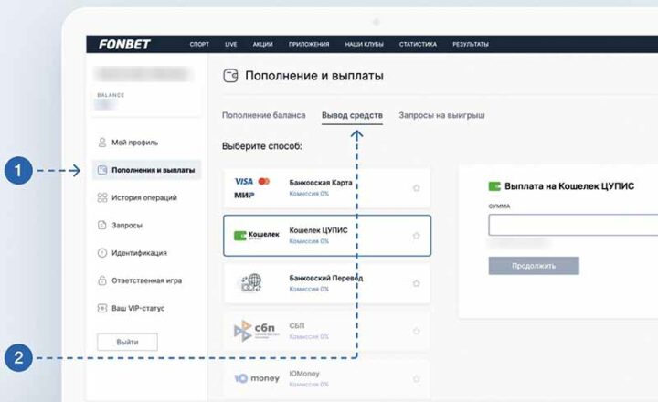 Оформление заявок на получение денег осуществляется в Личном кабинете Фонбет во вкладке «Пополнение и выплаты». Снятие средств доступно на те реквизиты, с которых клиент ранее совершал депозит.