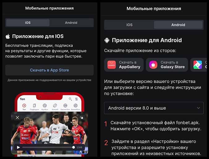 Если перейти на сайт конторы с Айфона, то система предложит открыть App Store. Загрузка приложения Fonbet на Android осуществляется напрямую с указанной на скриншоте страницы либо через маркетплейсы.