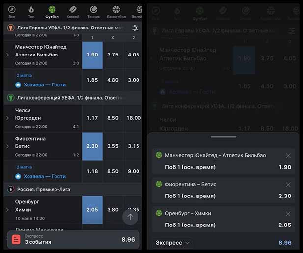 В экспресс можно добавить несколько исходов из одного матча. Однако если они являются взаимозависимыми (например, П1 и проход команды в следующий раунд), то будет учитываться только событие с наибольшей котировкой.