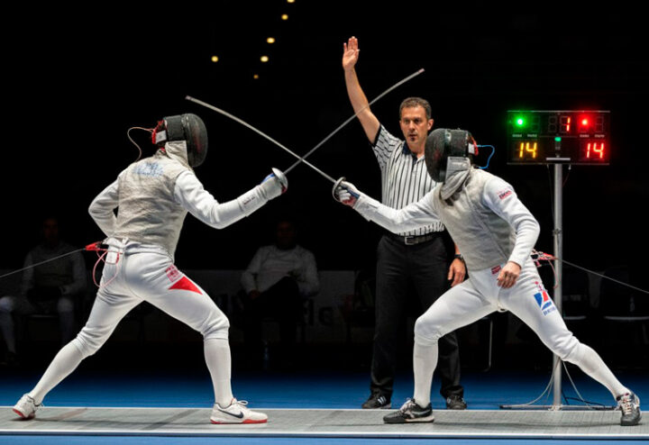 Это олимпийская дисциплина, в которой два спортсмена ведут поединок на холодном оружии: рапире, шпаге или сабле. Их задача — нанести сопернику валидный укол (или удар), избежав ответного попадания.