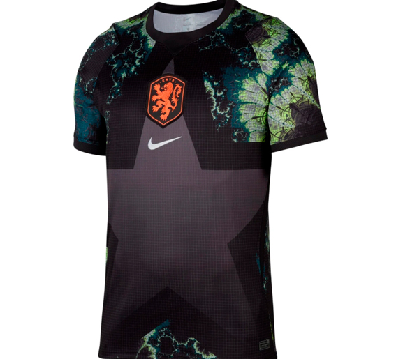 Основной комплект выполнен в черном цвете, который дополнен сложным абстрактным принтом. Рисунок, напоминающий зеленые мраморные разводы или грозовые облака, расположен на плечах, верхней части груди и по нижнему краю джерси. Выглядит это дерзко и необычно, заметно выделяя вратаря на фоне полевых игроков. Оранжево-черный герб KNVB и белый логотип Nike расположены строго по центру груди, один под другим.