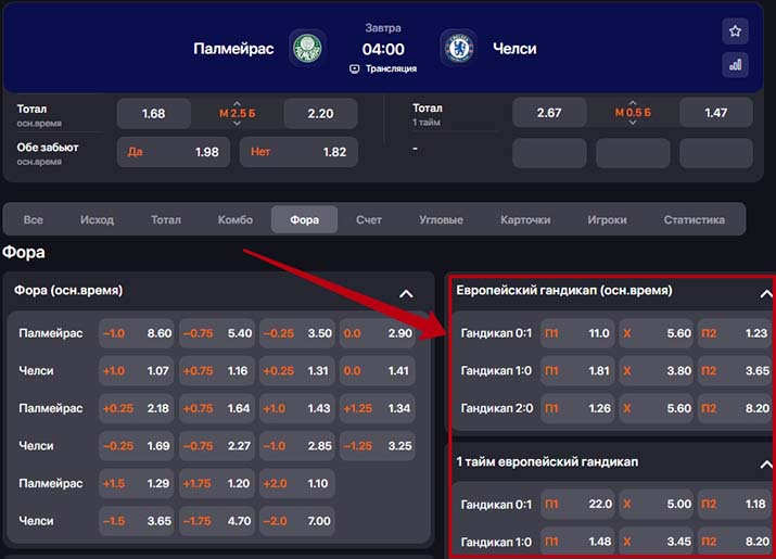Например, в БК Винлайн европейская фора означает условный точный счет (ТС), который будет учтен при расчете пари. Альтернативное название этого рынка — тройной гандикап.