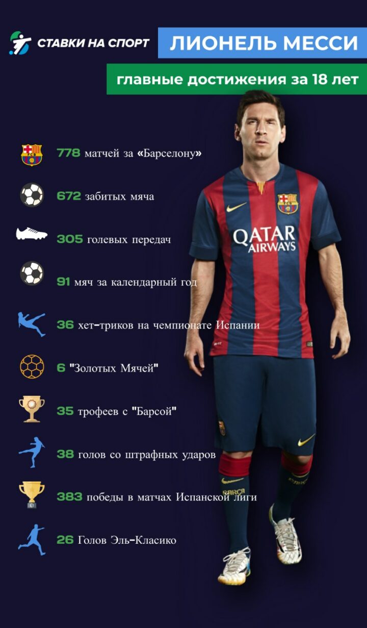 5 августа весь футбольный мир был шокирован новостью: новый контракт Лионеля Месси с «Барселоной» не будет подписан, и аргентинец покинет каталонский клуб, в котором выступал с 2003 года. Мы собрали все самые важные рекорды и достижения легендарного нападающего в инфографике.