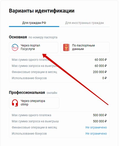 Данный метод верификации в Олимпбет подходит тем, у кого есть верифицированный аккаунт на портале Госуслуги. Необходимо кликнуть по соответствующей вкладке.
