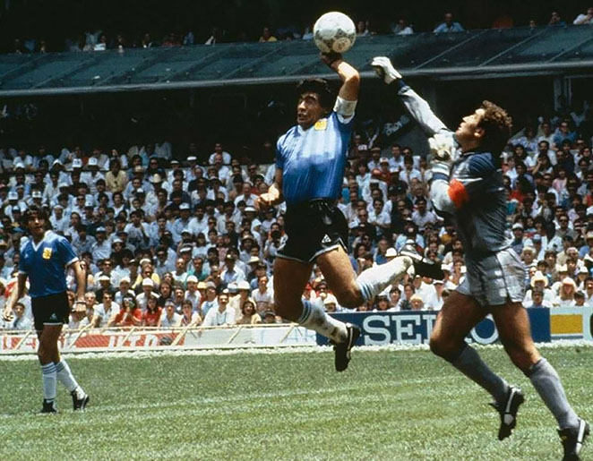 В ¼ Аргентина обыграла Англию. Дубль сделал Марадона в начале второго тайма. Сначала он забил рукой, арбитр встречи засчитал гол. После Диего шутил, что это была рука Бога. Через четыре минуты Марадона забивает англичанам второй мяч.