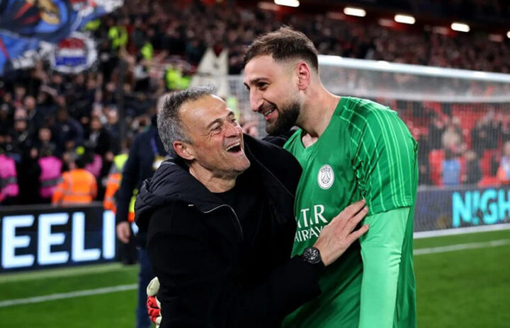 Фото: Getty Images 11 марта 2025 года, Ливерпуль. «Ливерпуль» — ПСЖ — 0:1, пенальти 1:4. Джанлуиджи Доннарумма, только что отбивший два 11-метровых, празднует выход в четвертьфинал Лиги чемпионов вместе с Луисом Энрике. Через 5 месяцев тренер уберет вратаря из команды.