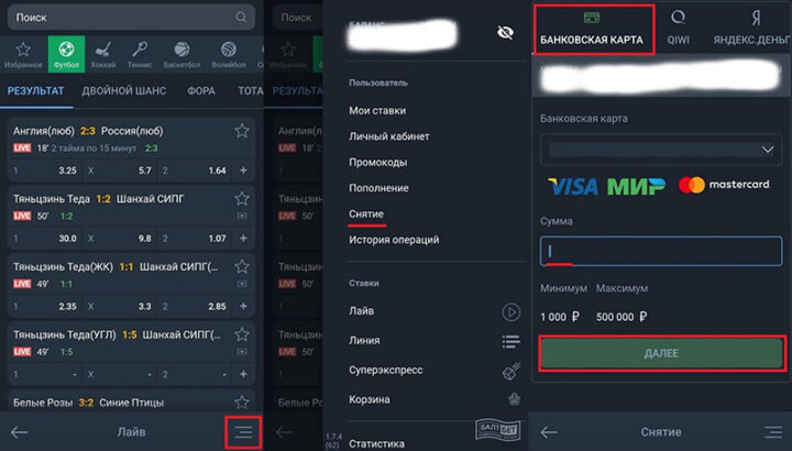 Букмекер предупреждает игроков, что деньги не выводятся, если текущий баланс меньше суммы заявки. Снятие возможно на карты систем Мир, Visa, Mastercard.