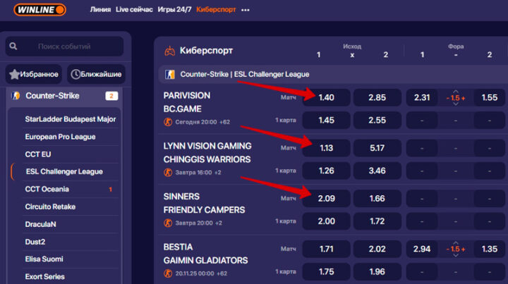Для оформления экспресса в Winline необходимо добавить в купон минимум два независящих друг от друга события. К примеру, решено поставить на победы номинальных хозяев в трех поединках на ESL Challenger League. Как это сделать: