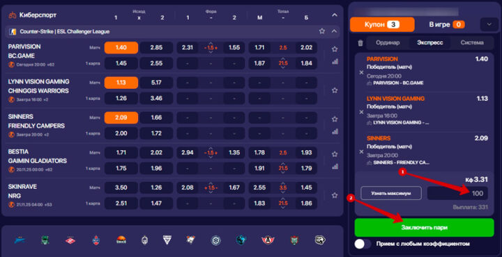 Допустим, клиент БК Winline хочет оформить киберспортивный экспресс-прогноз на Counter-Strike. Соревнование — ESL Challenger League, размерность купона — три события, номинал пари — 100 рублей.