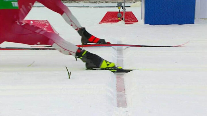 Фото: matchtv.ru 7 декабря 2025 года, Тюмень. Фотофиниш масс-старта: Савелий Коростелев на какие-то сантиметры опережает Александра Большунова.