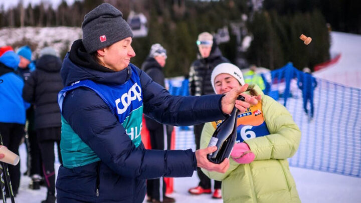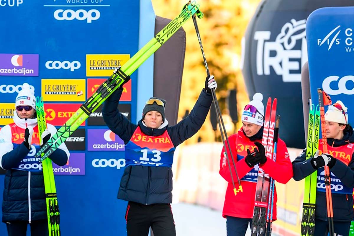 Фото: Global Look Press Савелий Коростелев и Дарья Непряева празднуют свой двойной успех на Тур де Ски 2025/26