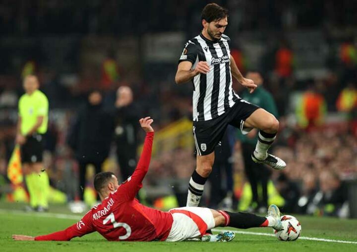Фото: Getty Images 7 ноября 2024 года, Манчестер. «Манчестер Юнайтед» — ПАОК — 2:0. С мячом — Магомед Оздоев.