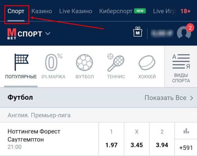 Для оформления прогноза беттору нужно авторизоваться в аккаунте и перейти к списку доступных событий. Для этого необходимо нажать на вкладку «Спорт» в верхнем или нижнем меню мобильного приложения.