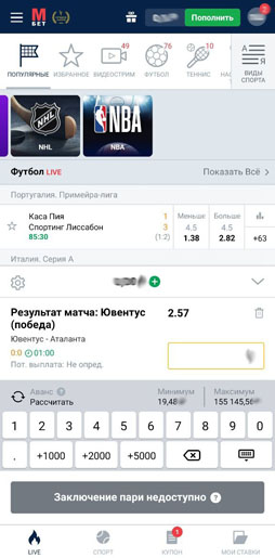 Для удобства букмекер добавил цифровую клавиатуру, в которой дополнительно указаны размеры минимальной и максимальной сумм