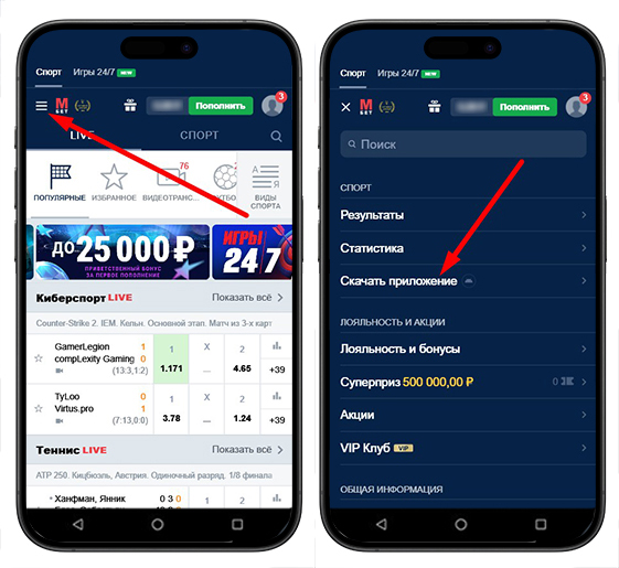 Адаптированная под портативные устройства веб-версия Марафонбет имеет немного другую структуру. Чтобы попасть на страницу скачивания софта, игроку необходимо развернуть гамбургер-меню и кликнуть по соответствующей ссылке.