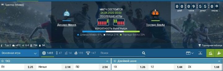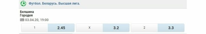 Проведем такие вычисления, но для рынка с тремя возможными исходами. В качестве примера возьмем встречу в рамках чемпионата Беларуси по футболу «Белшина» – «Городея».