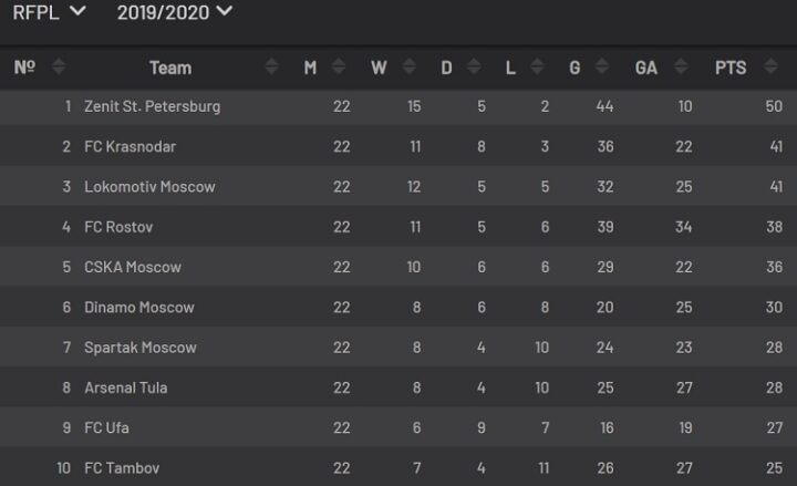 Объясним данный принцип на практике. Турнирная таблица РПЛ сезона 2019/2020, до конца чемпионата осталось 8 туров.
