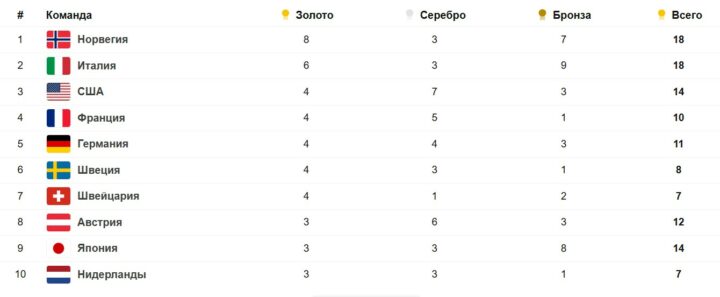 Седьмой соревновательный день Олимпиады-2026 принес семь комплектов наград и не изменил раскладов в верхней части турнирной таблицы. Сборная Норвегии по‑прежнему возглавляет медальный зачет с 8 золотыми, 3 серебряными и 7 бронзовыми наградами. На второй позиции идут хозяева Игр итальянцы (6-3-9), замыкают тройку американцы (4-7-3).