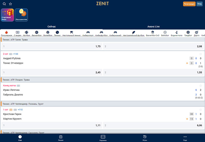 После прохождения идентификации и внесения денег на счет игроку открывается доступ к беттингу. Подбор матчей можно осуществлять уже со стартовой страницы. При этом на ней выводятся только live-события. Для просмотра всей линии необходимо перейти в одноименный раздел посредством нижнего меню.
