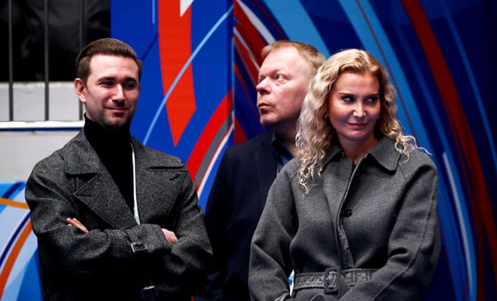 Фото: sport24.ru Тренеры Аделии Петросян Этери Тутберидзе (справа), Даниил Глейхенгауз (слева) и Сергей Дудаков