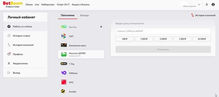 Для пополнения в БетБум предусмотрены 9 методов. Совершить депозит можно при помощи СБП, банковскими картами, через кошелек ЦУПИС или ЮMoney, сервисами SberPay, T-Pay или переводом с баланса билайн, МТС, МегаФон, t2. Комиссия за пополнение не предусмотрена (кроме варианта с мобильной коммерцией). Ниже перечислены все методы, описаны возможные проблемы при депозитах и даны ответы на частые вопросы по теме.