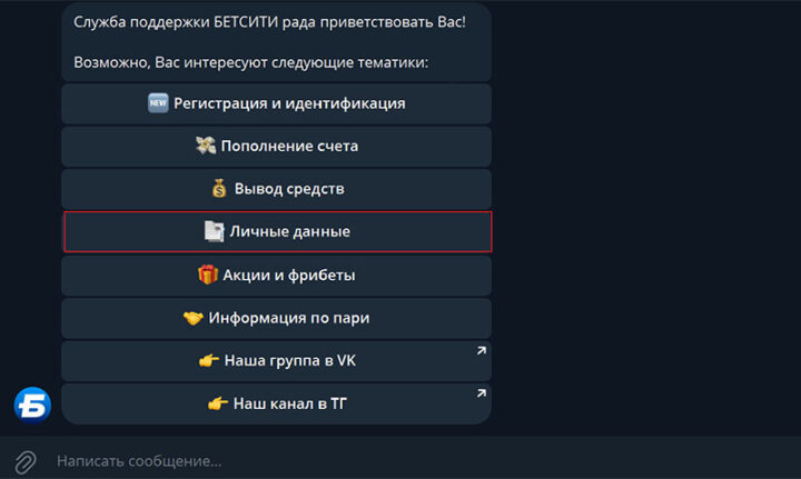 В Телеграм-канале клиентам открывается меню с разными темами по работе БК. Информация о доступе к сайту Betcity располагается в разделе «Личные данные».