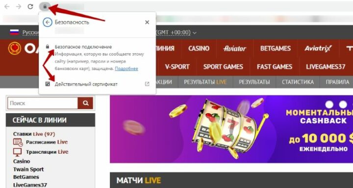 - Отсутствие сертификата безопасного подключения. О его наличии свидетельствует значок в виде замка, расположенный в начале адресной строки браузера. При нажатии на него пользователь должен увидеть два уведомления: «Безопасное подключение» и «Действительный сертификат».