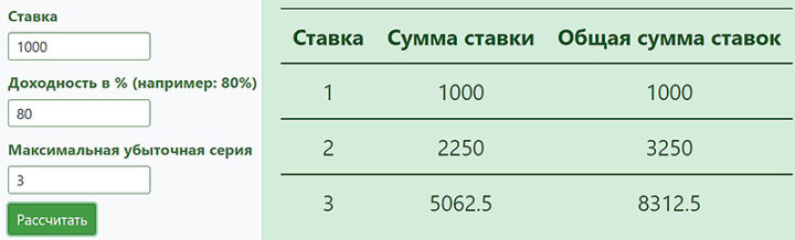 Теперь пользователю необходимо отнять от выигрыша сумму последней ставки и количество проигранных денег: 19200 − 9600 − 9300 = 300. Пользователь вышел в плюс на 300 рублей.