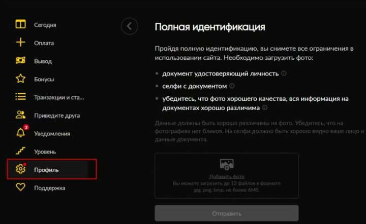 БК требует от клиентов верифицироваться при подаче первой заявки на вывод средств. В разделе Личного кабинета «Профиль» необходимо подтвердить электронный адрес и загрузить фотографии.