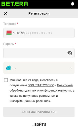 Для регистрации в букмекерской конторе Betera на официальном сайте следует указать номер телефона и пароль. Далее: галочкой отметить согласие с политикой и условиями работы компании, подтвердить совершеннолетие и кликнуть на «Зарегистрироваться».