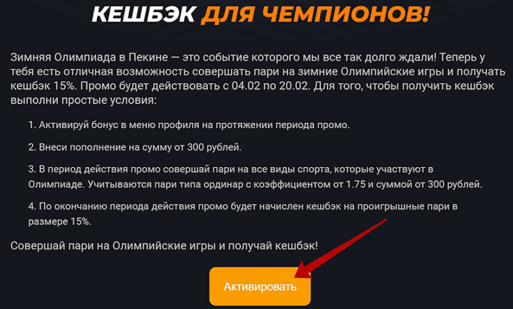- Спортивный кешбэк 15% до 12 000 рублей. Для получения необходимо сделать пополнение от 500 RUB и расставить ординары на футбол, баскетбол, ММА, бокс, теннис, волейбол или хоккей. Множитель — от 1.75. Когда весь депозит будет проставлен, зачислится равный ему бонус (до 12 000). Для вывода требуется отыгрыш с вейджером х22.