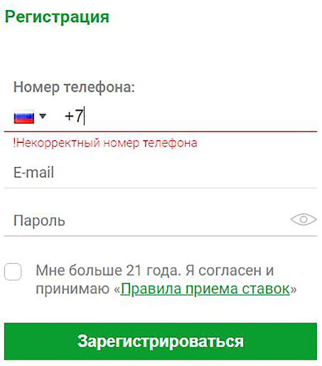 Букмекер практикует быструю регистрацию только через мобильный телефон. БК не предлагает создание профиля с использованием электронной почты, мессенджеров и соцсетей.