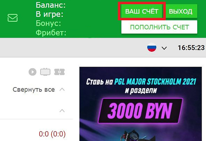 Чтобы пройти идентификацию, игрок переходит в ЛК. Далее нужно нажать кнопку «Ваш счет», размещенную справа в «шапке» сайта.