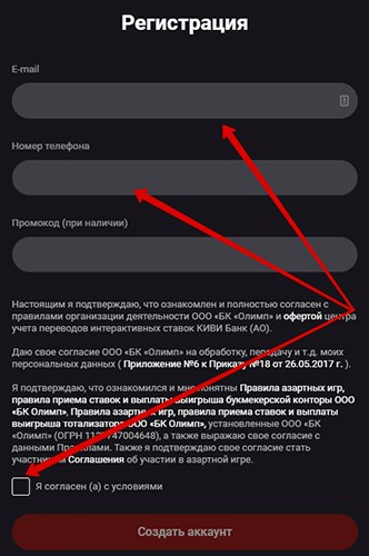 Появится форма, в которой беттору нужно указать телефон (обязательно российский, начинающийся с +7) и адрес email. Также можно ввести промокод, например, из акции «Пригласи друга». В конце требуется поставить галочку напротив надписи о согласии с условиями и кликнуть по красной кнопке «Создать аккаунт».