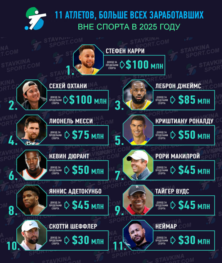 С каждым годом бизнес-доходы ведущих атлетов мира растут. 2025-й не станет исключением. В этом году отметку в 100 млн долларов США на рекламных контрактах впервые преодолели 2 представителя топ-5 рейтинга. В фирменной инфографике редакция vsestavkinasport.com расскажет про 11 звезд спорта, которые в 2025 году заработали больше остальных на инвестициях, партнерстве и бизнесе.