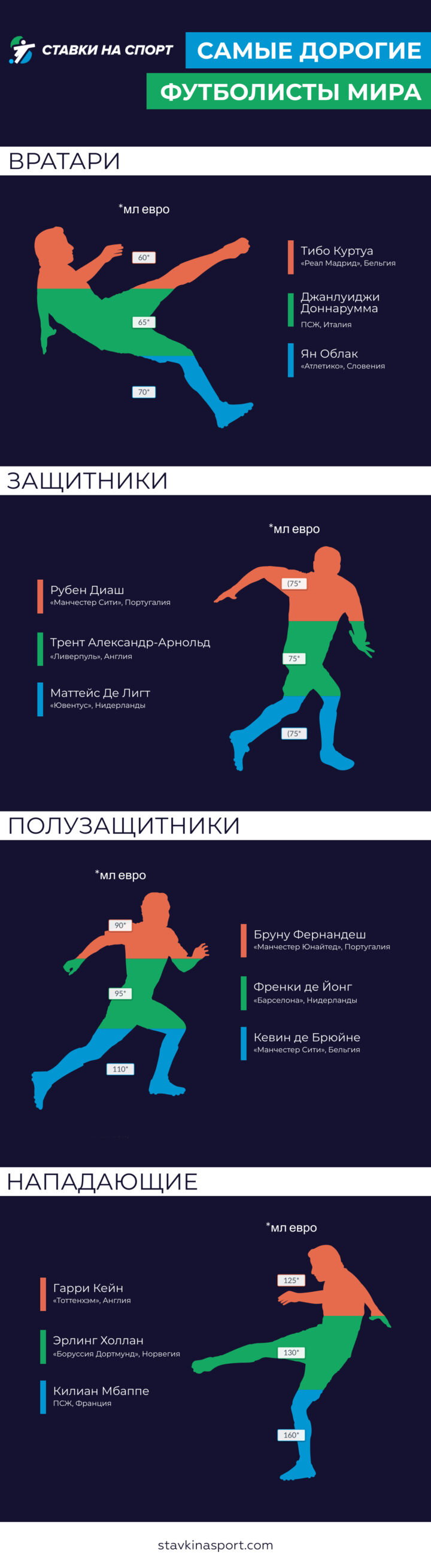 Деньги в современном футболе не всегда играют определяющую роль. Как пример, сборная Италии, победившая на чемпионате Европы 2020 года. При этом у Англии, Франции, Испании, Германии и Португалии суммарная стоимость игроков состава была выше. Чаще исход турнира решает именно командное взаимодействие, однако в каждом коллективе должен быть звездный лидер. О самых дорогих спортсменах в мировом футболе — в инфографике от сайта Stavkinasport.